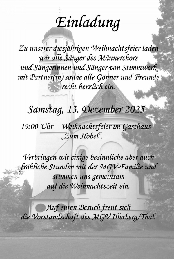 Herzlich willkommen beim Männergesangverein Illerberg/Thal e.V., gegründet 1893. Die Gemeinde Illerberg/Thal ist ein Ortsteil von Vöhringen an der Iller und liegt etwa 20 km südlich von Ulm/Donau.